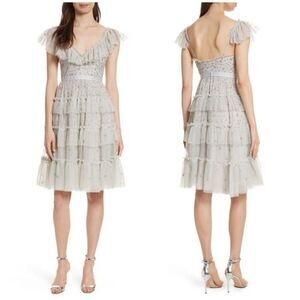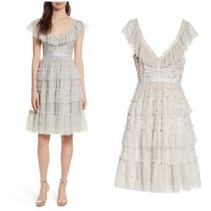 Ruffled tiers of swishing tulle dotted with light-catching sequin blossoms enrich a romantic dress that also captives with a decolletage-highlighting neckline and open back. Grosgrain ribbon wrapping a slim waist accentuates the ultrafeminine fit-and-flare silhouette. Style Name: Needle & Thread Sunburst Tiered Dress. Style Number: 5504551