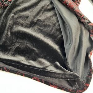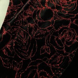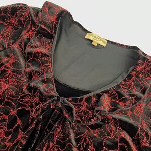 A cute vintage 90s 3/4 sleeve black velvet ruffle neck bolero top with a red glitter floral pattern, size petite large. In excellent vintage condition.