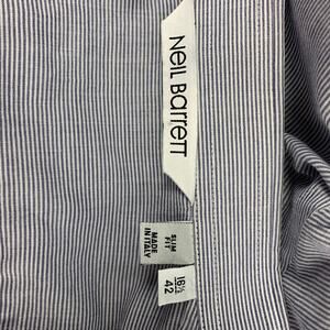 NEIL BARRETT long sleeve shirt comes in a blue stripe cotton featuring a slim fit, raw edge, spread collar, and a hidden placket closure. Made in Italy.