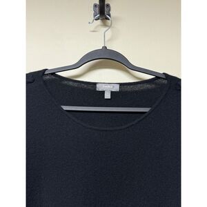 Beautiful black soft cashmere sweater with braid detail down the arms and a handkerchief, asymmetrical hemline. Crewneck. Handwash cold and lay flat to dry.