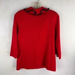 NEIMAN MARCUS Knitted ¾ Sleeve Top with Faux Leather Trim on Ruffled Collar. Red w/Black.