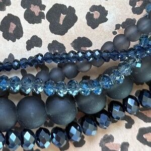 designer, glass, faceted, smooth, statement, medium weight, gray, blue, multi strand