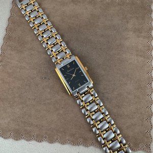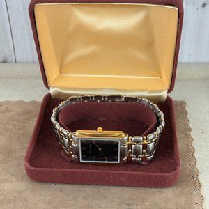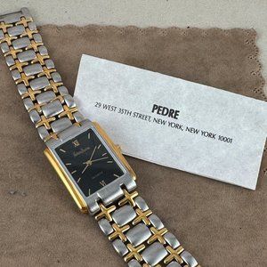 Vintage Neiman Marcus Pedre Man's Quartz Watch Enameled Midnight Black Dial, Roman Numerals, Gold hands and Raised markers 1.375x1 inch Case. Art Deco Styled Tank Case with 2 Tone Bezel Heavy Gold Plated Link 8.25 Inch by 1 inch wide Bracelet (has extra Link) Stainless Steel Back Japan Movement Pre-Owned, Like new Condition, New AG1 Battery will add a spare. Really, Really Nice Man's dress styled Watch dated around 2002