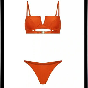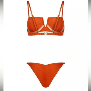 BRASSIERE-LIKE BIKINI TOP WITH THIN STRAPS AND "V" CLEAVAGE. BASIC BIKINI BOTTOM WITH ADJUSTABLE STRAPS.