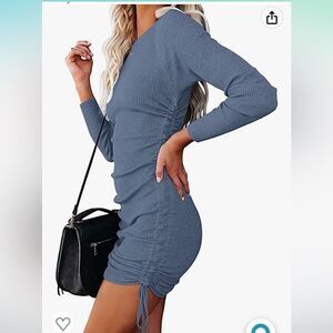 NENONA Ruched Midi Dress Long Sleeve Side Drawstring Ribbed Knit Bodycon Dress