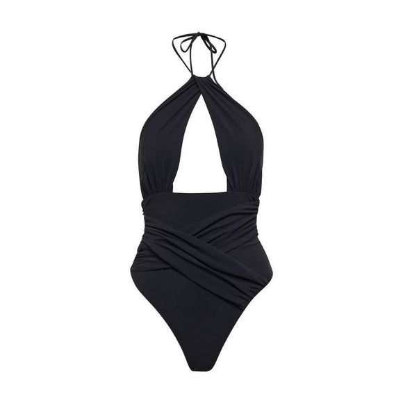Nensi Dojaka translates its signature allure into beach-ready designs like this cutout swimsuit. The one-piece is made from figure-forming swim jersey and features a halterneck, ruched front, and strapped back.