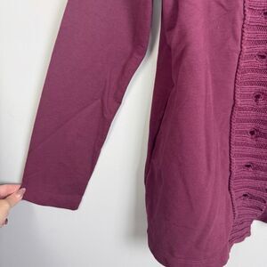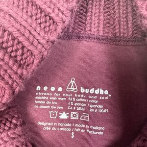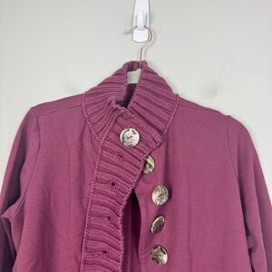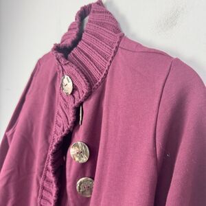 Stylish cardigan jacket with unique oversized button design by Neon Buddha. Perfect for layering. Long sleeves. Pockets. Plum color with wood look brown buttons. Great preowned condition. Women’s size small.