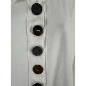 NEON BUDDHA White Cotton Blend Button Front Long Sleeve Top/Shacket Sz L. Cute button detail with a variety of button designs. Front slot pockets. Fun pocket detail with tie knots. Wear as a top or a light jacket.