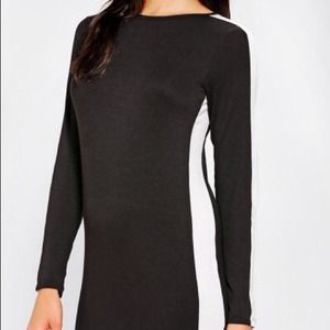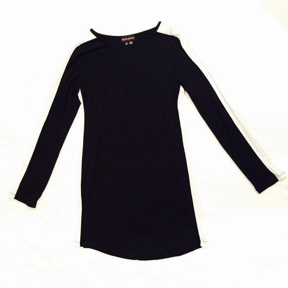 Seriously soft and stretchy knit tee shirt dress from Neon Moon with color-blocked long sleeves. Cut in a gently fitted silhouette with a rounded hem. Finished with a banded scoopneck. Pullover construction.