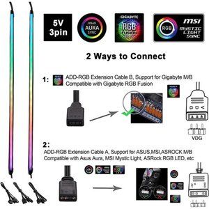 🧿☀PACKAGE INCLUDES: 1x ADD RGB extension cable A(for ASUS, MSI, ASROCK ect), 1x ADD RGB extension cable B(for Gigabyte), 1x extension cable, 2 x 15.7inch Neon Digital-RGB LED Strip.