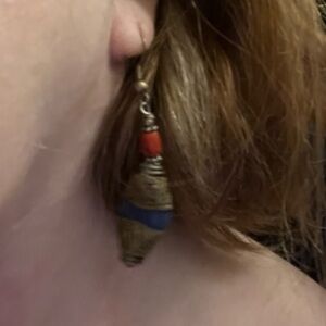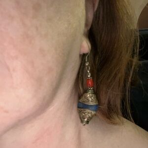 Nepalese dangle earrings, waist in middle, semiprecious stones- looks like lapis- really pretty, but as you can see they don’t really show up on my hair LOL!