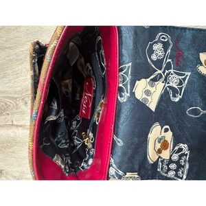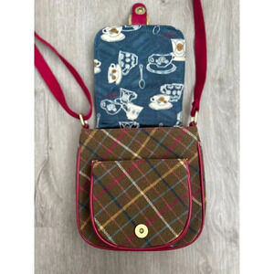 This is a gorgeous 70% wool plaid tweed crossbody satchel style messenger bag by Ness. The bag has lovely detailing with one main compartment and flap over front with feature buckle. The bag has an adjustable shoulder/crossbody strap and can be worn on the shoulder or crossbody style. The bag has a soft shell in a textile wool main in brown, navy, yellow, aqua and pink with contrast pink PU leather trim. The Ness branding can be found imprinted onto a metal buckle on the front, into the metal zip pullers and badge on the inside. The interior is in a contrast tea cup print lining and is clean with no discoloration. Overall the bag is in very good condition with light general wear and hardly used. Please see pictures for more details.