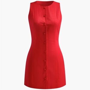 Brand new with tags Commense button-front mini dress in a bold, classic red. This sleeveless silhouette features a structured bodice, flattering seam detailing, and fabric-covered buttons down the front for a timeless, feminine look.
