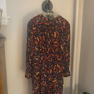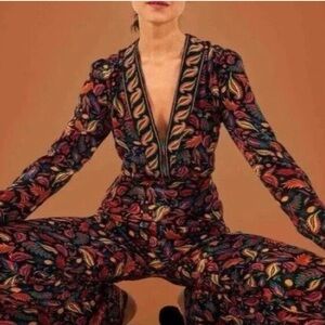 Bold jumpsuit with a colorful leaf pattern and tiny pineapples Features long sleeves and a V-neck. Brand new, never worn, absolutely no flaws. Zippper at rear neck. Perfect for making a statement. Waste approximately 15 1/2 inches. Sleeve from shoulder drop approximately 25 inches. Inseam approximately 27 inches.
