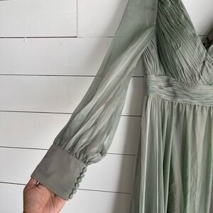 Romantic maxi dress with a pleated bodice and faux-wrap v-neckline, tiered floor-length skirt, and sheer long sleeves.