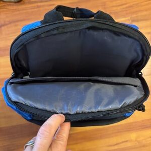 Stylish black and blue backpack with multiple compartments. Perfect for school or travel.