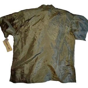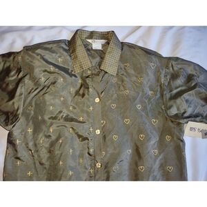 This stunning vintage Melrose Silk outfit is a must-have for any fashion-forward woman. The 2-piece set includes a green chiffon top with hearts and X's novelty design, perfect for a casual day out or a formal occasion, and a wrap skirt, also in size 14, with a button closure. The outfit features short sleeves, a collared neckline, and shoulder pads for added structure.