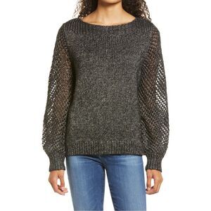 Become your own knight in shining armor in this sweater knit from glinting metallic threads that lend it an irresistible chain-mail effect. A flattering bateau neckline and balloon sleeves knit with an open stitch reveal just a touch of skin.