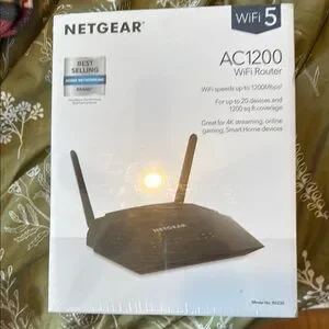 NETGEAR AC1200 WiFi Router with dual antennas. Ideal for streaming and smart home devices.