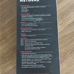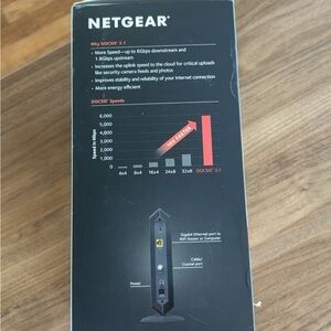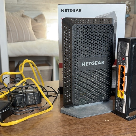High-speed NETGEAR cable modem. Sleek black design. Ideal for fast internet connections. Comes with CM 1000 Ultra High Speed Cable Modem as seen details on box as well as the second router seen in pictures. Cords included to be compatible with each other. Works great with multiple internet options. No longer needed for our current WiFi.