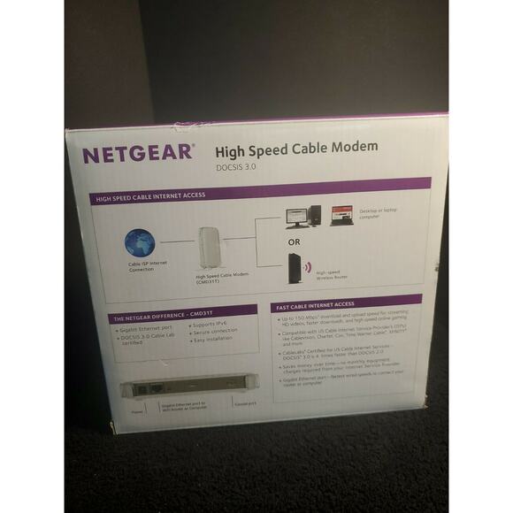 NETGEAR CMD31T-100NAS Cable Modem. Modem still in plastic. Smoke free home. Compatible with US Cable internet providers like Cablevision, Charter, Cox,Time Warner Cable, Xfinity and more.