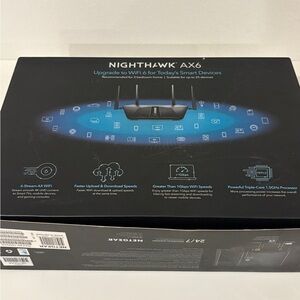 The NETGEAR® Nighthawk® AX6 6-Stream AX4300 WiFi Router delivers a new level of high-speed Gigabit WiFi connectivity. Perfect for busy households, it can handle up to 25 devices simultaneously.