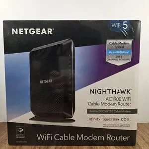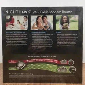 Brand new, still in packaging. Experience high-speed internet with the NETGEAR Nighthawk WiFi Cable Modem Router. Its sleek black design complements any setup while delivering up to 800Mbps speed for seamless connectivity.