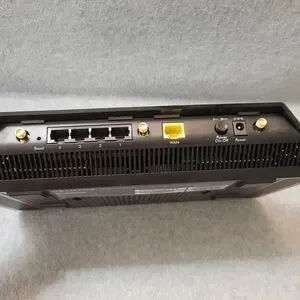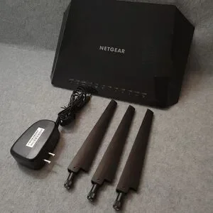 NETGEAR WiFi router with three antennas. Sleek black design.