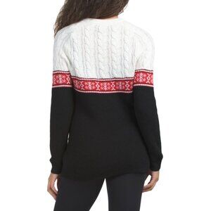 cable knit construction, color block design, baby ribbed collar, cuffs and hem