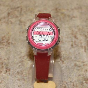 This women's watch has a quality, comfortable rubber band. Water resistant. Has indinglo night light feature. Has many features including an alarm and stopwatch. Displays the date. This is a great gift for any age girl.
