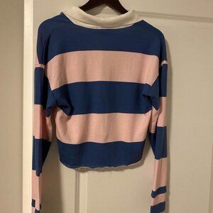 Stylish semi cropped top, rugby, long sleeve top with pink and blue stripes. Features a white collar for a classic touch.