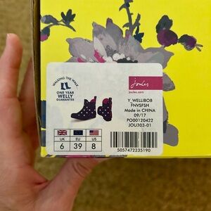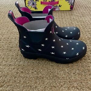 Navy rain boots with pink details and white stars. Cute box and tags. Never worn. Size 8.