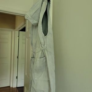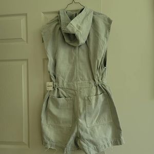 The color is more of a SAGE color with Two large front lower pockets, two back pockets large arm openings and a hood to cover your head. The material is heavy for long wear and it has distressed leg openings. If you are a small frame and want the baggy look..go for it. If you are of medium frame you may get a baggy look, if large frame it will probably just fit. Can come in handy when out in your swimsuit and need a coverup ...remember fp clothes runs large.
