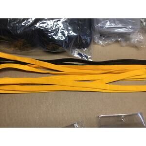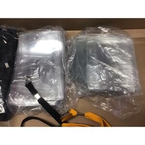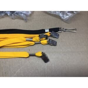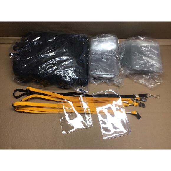 This is a complete solution for large group identification needs, perfect for conferences, trade shows, business events, schools, or security staff. The lot contains 100 unused (new old stock/handled condition) black lanyards and a mix of vertical and horizontal clear badge holders. All are unused but are in no packaging, they have been handled and moved around.