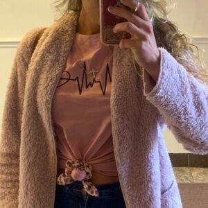 Looking for a super comfy and totally cute t-shirt? Well, this one is made from 100% cotton and has the most adorable EKG heartbeat rhythm print on the center front. Crew neck and short sleeves. Pretty blush pink color. Won’t shrink in washer! Check out my “Style Suggestion!”