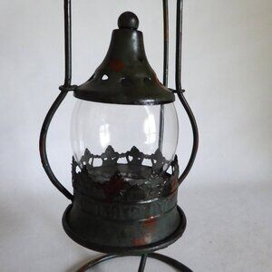 New, never used for its purpose, table top, hanging, metal & glass tea light lantern on stand. The lantern can be removed from its base. I have included a bonus, color changing, battery powered light to use instead of an actual flame. You slowly slide up the lid to have access to the glass area. (See photos for details) I am the original owner. It has been in climate controlled storage since acquired. Comes from a pet and smoke free home.