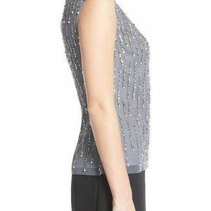NEW $148 Adrianna Papell Pearl Beaded Mesh Top Blouse in Grey [SZ 14 16 ]