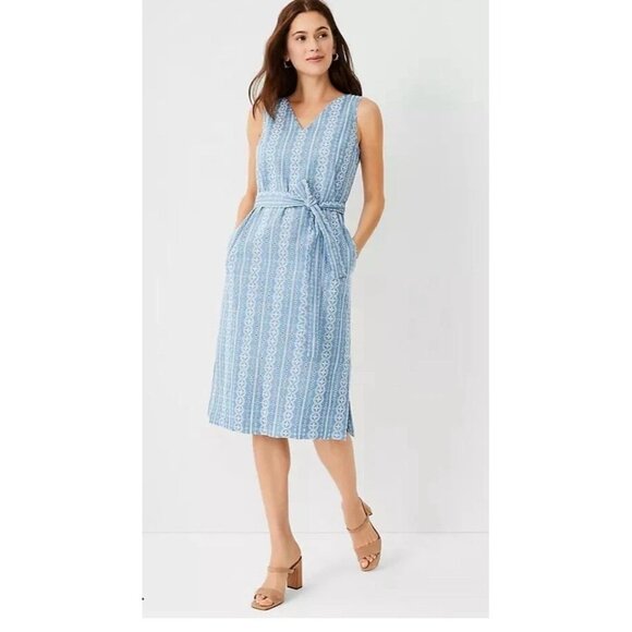 NEW $169 Ann Taylor Embroidered Chambray V neck Midi Dress Blue belted womens 8