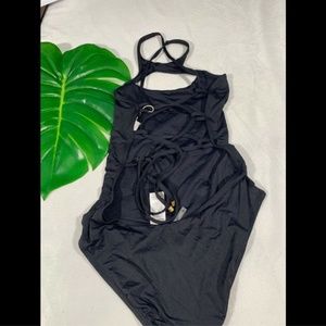 A sophisticated and ultra-chic one-piece swimsuit with a high neckline, a seductive laced-up back, and front cutout detail will have heads turning your way. - High neck - Cutaway shoulders - Back tie closure - Solid colorway - Front cutout detail - Full coverage - Lined - Made in USA