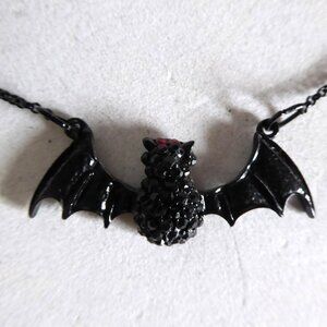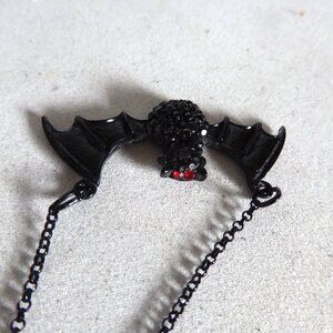 New, never worn, gothic, black metal chain with a bejeweled vampire bat, necklace / choker with lobster claw closure. HIs body is bejeweled in black jewels. And his eyes are red jewels. (See photos for details) I am the original owner. It has been in climate controlled storage since acquired. Comes from a pet and smoke free home.