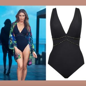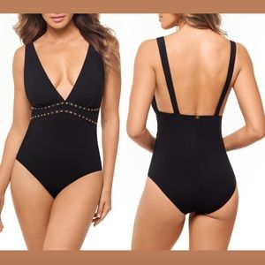 Feel every inch the glam seaside goddess in this plunge-neck swimsuit in a slimming control fabric with rows of studs at the narrowest part of the figure.