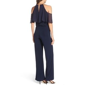 NEW $188 XSCAPE [ 2 ] Halter Cold Shoulder Ruffle Jumpsuit in Navy Blue