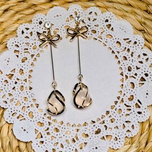 Elegant Caged White Tiger’s Eye, 18K Gold Plated over 925 Silver, Crystal and Bow Drop Earrings.