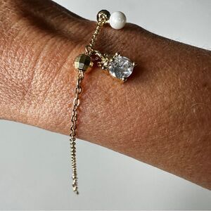 TAGS: 18K Yellow Gold Plated Fashion jewelry Faux Pearl & Crystal CZ Cubic zirconia Charm Adjustable Bracelet Evening Girls Date Night Church Festival Business Casual Wedding Bridesmaid