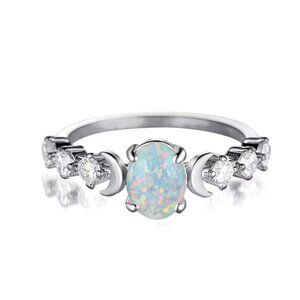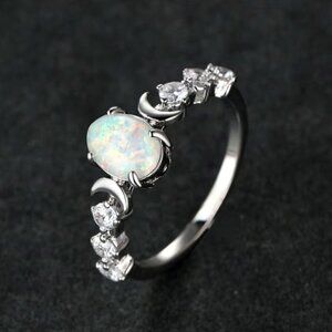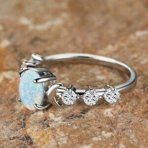 NEW 18k White Gold White Fire Opal Diamond Ring Dainty Moon Ring
