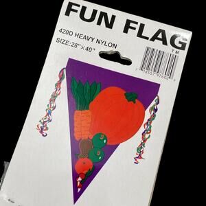 New from the 90s and never used, this fun flag is still in it's original pack. (First photo from packing graphic for reference) Features pumpkins and a fall harvest theme. 28" x 40". Please see photos for condition. Flag may be folded to fit in packing. Smoke Free Home.