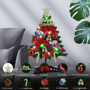 PACKAGE CONTENTS : You will receive 1 Christmas tree and Chrismtas tree stand, 1 Chritmas tree light string, 1 star treetop, 1 gold Merry Christmas, 2 bows, 2 candy, 2 Christmas balls, 2 pine cones, 2 candy canes, 2 bongo, 2 gift boxes, 2 jingle bells. Let's make a cute Christmas tree.