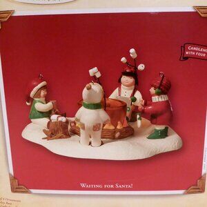 New, never taken out of the package, Hallmark Keepsake Ornament, handcrafted, 6 piece, decorative tealight holder entitled “Waiting for Santa”. Features 4 removable ornaments of children roasting marshmallows over a campfire. Comes with tea light with real wax candle and a snow base that they all sit on. Includes Holiday Memory card. (See photos for details) I am the original owner. It has been in climate controlled storage for years. Comes from a pet and smoke free home.