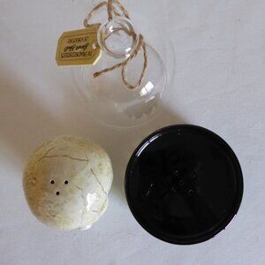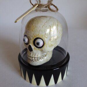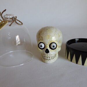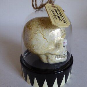 New in box, 2005, Department 56 brand, “Dr. Frankenstein’s Laboratory”, “Donor Skull”, ceramic, salt and pepper shaker set. This is a 3 piece set: plastic dome with tag, skull and pedestal base.