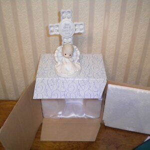 The NEW 2005 Precious Moments Boy Figurine is a multicolor porcelain collectible featuring a cross design. This figurine is part of the Precious Moments collection and comes boxed, making it a perfect gift for occasions like communion and confirmation. Made in Indonesia in the year 2005, this original figurine with the brand Cross is a unique and meaningful addition to any decor. Back has Name and christening date that can be filled in. Great Keepsake!! Hard to see, pillow is blue.